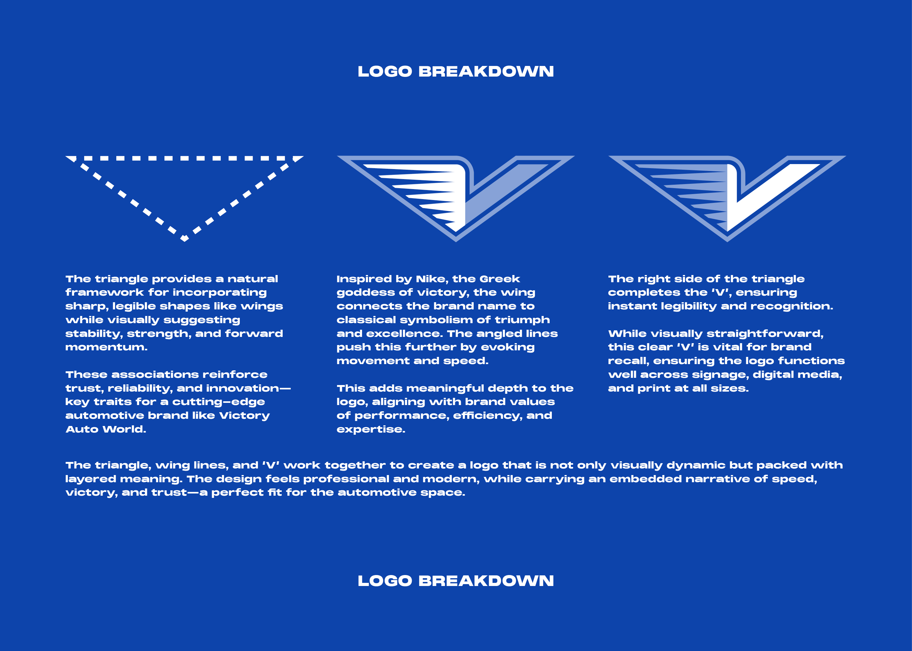 The designers at SOHO were tasked with creating a bold, professional logo for Victory Auto World, an automotive brand aiming to communicate expertise, efficiency, and modernity. This is my final design, which combines a strong triangular structure with a stylised wing and a clear ‘V’, symbolising speed, precision, and victory. Drawing inspiration from classical symbolism and streamlined automotive aesthetics, the mark is built to be instantly recognisable and versatile across digital and physical applications.